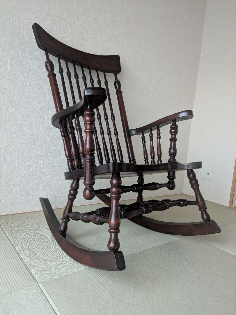 彫刻が施されたアンティーク風の木製椅子、ブラウンカラー。。1人掛けソファー maruni。- 素材: 木製- デザイン: 彫刻入りの背もたれ- スタイル: アンティーク風- 色: ブラウン- 使用状況: 良好ご覧いただきありがとうございます。ロッキングチェア ヴィンテージ ラタンお店の情報